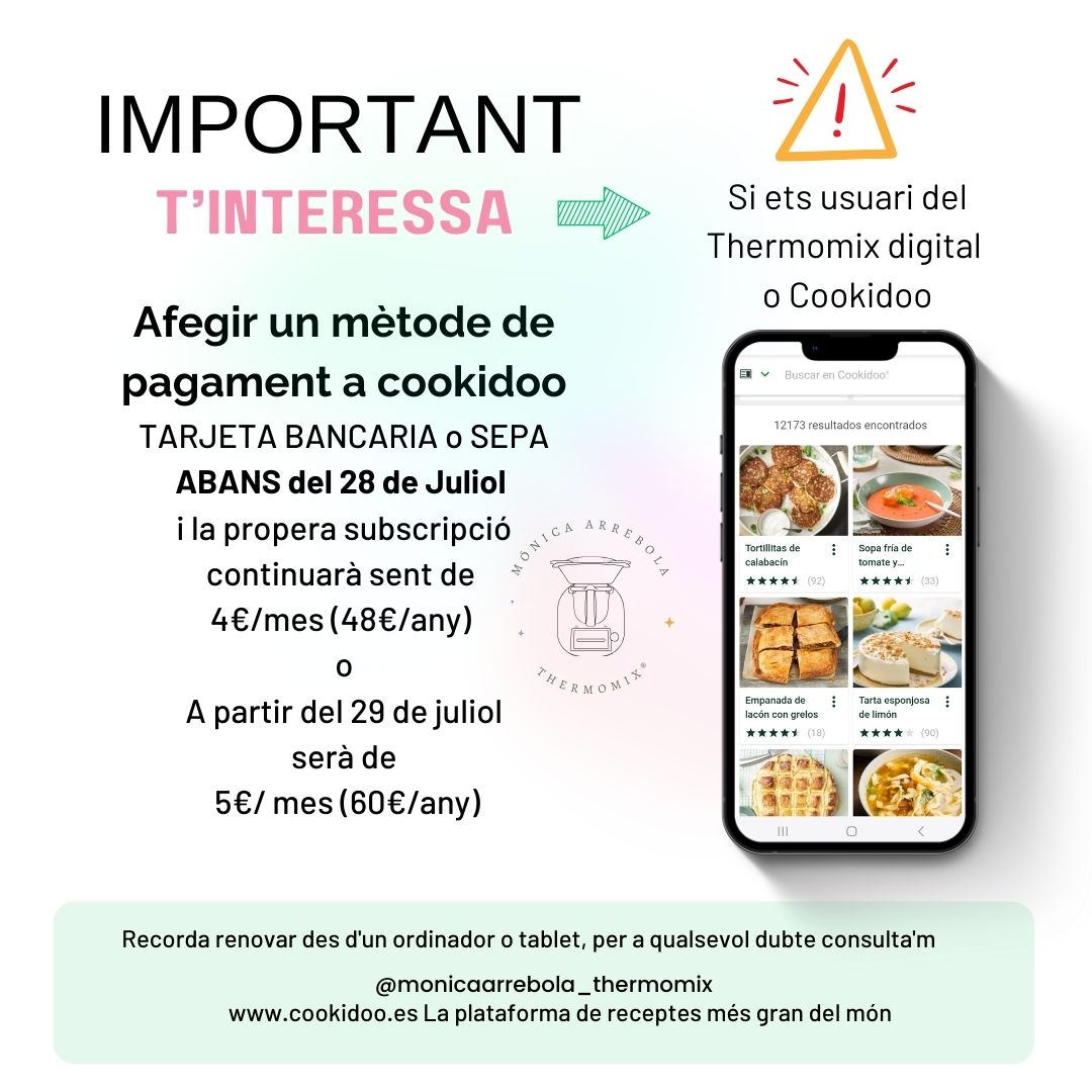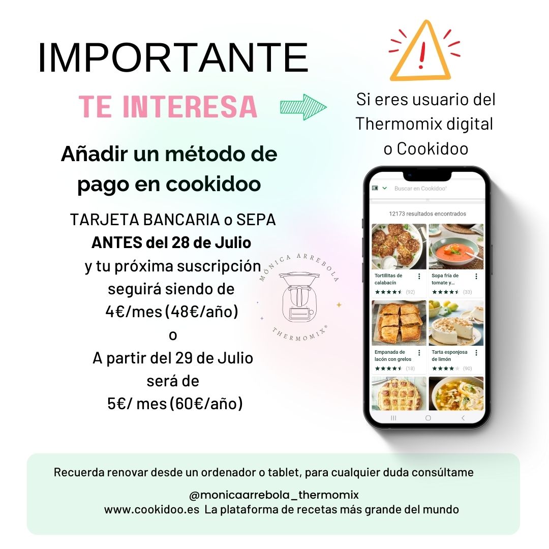 Solo informarte de que si añades un método de pago en cookidoo tipo: TARJETA BANCARIA o SEPA antes del 28 de Julio, tu próxima suscripción seguirá siendo de 4€/mes (48€/año) si no añades el número de cuenta o tarjeta a la plataforma de cookidoo, a partir del 29 de Julio pasará a ser de 5€/ mes (60€/año)