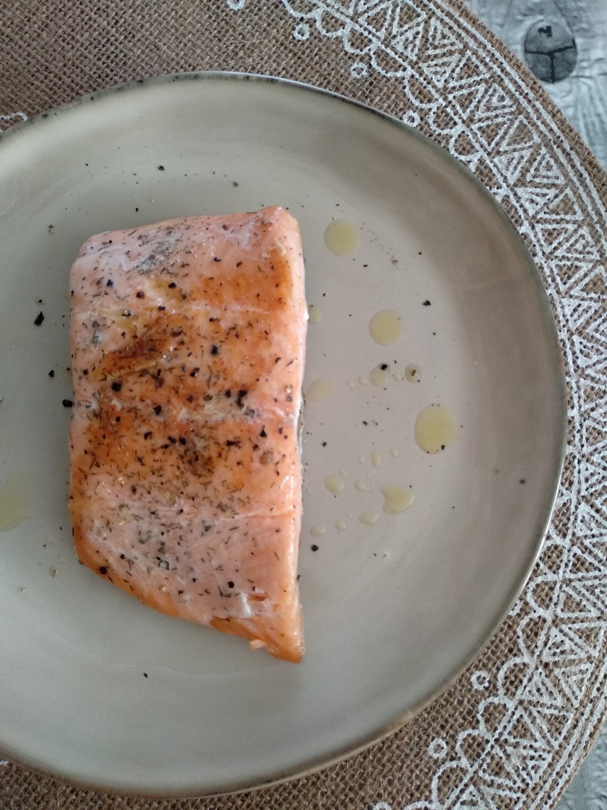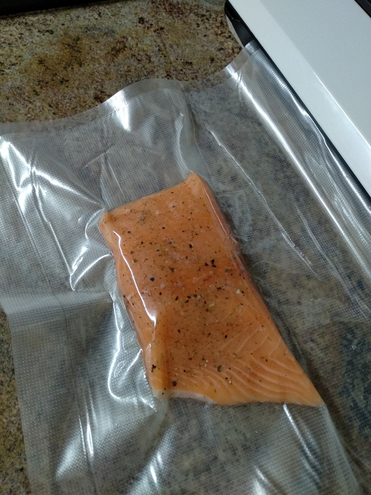 - Envaso al buit cada tall de salmó. Hi poso una mica de sal, pebre i anet. Reservo.