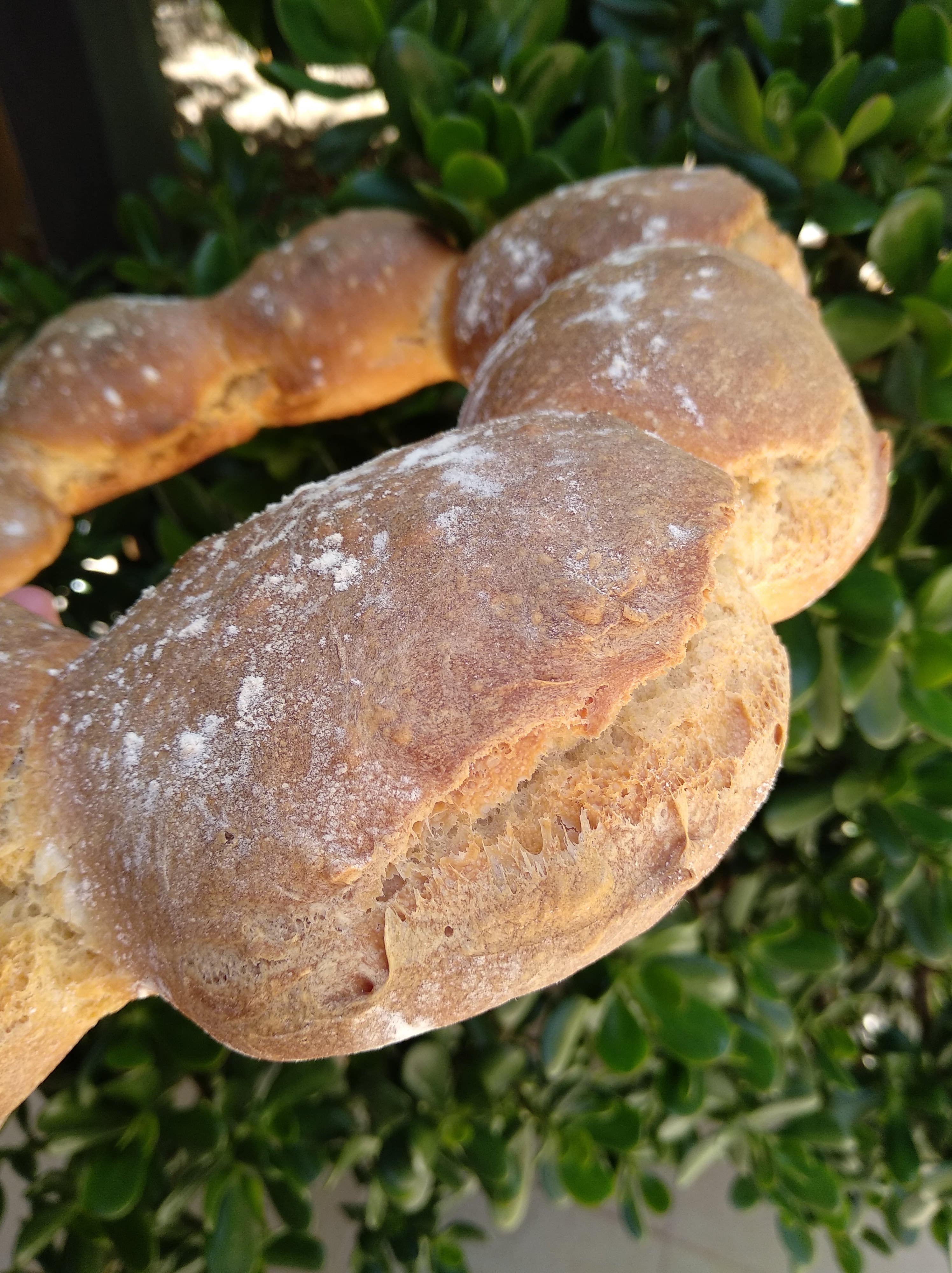 - Una vegada han passat els minuts de repòs treu la llanda del forn i passa la corona amb molta cura, vigilant no et cremis i que tampoc es desmunti el pa. Fes un tall en forma de lluna a cada peça del pa, per la part exterior. El tall ha de ser net!