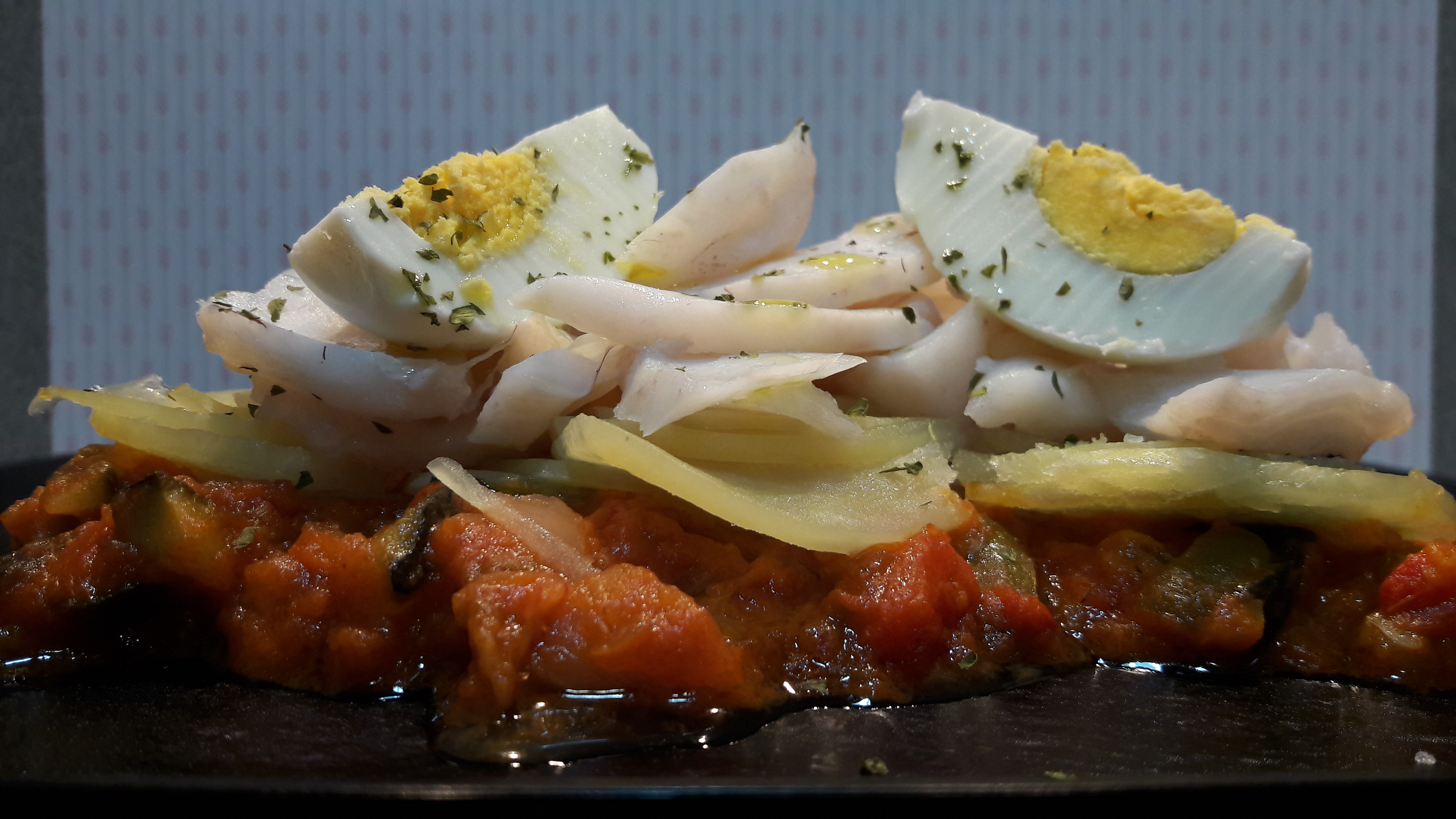 Menú completo pisto con lubina patatas y huevos
