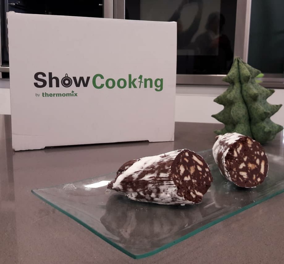Cuando esté frío, espolvoréelo con azúcar glas y vuelva a envolverlo con el film apretando con las manos para que el azúcar se pegue y haga el efecto de la piel del salchichón. Retire el film, corte en rodajas y sirva.
