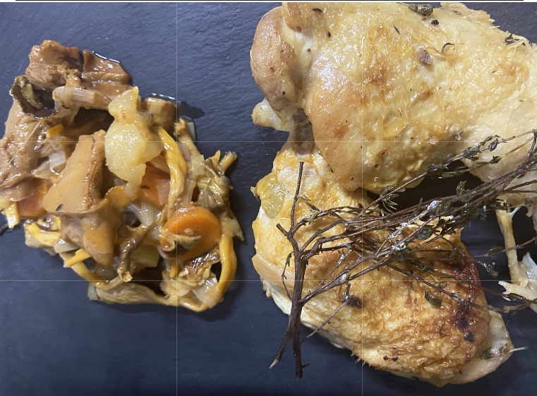 Que receta os propongo? Picantones con guiso de verduras, setas de temporada y pera